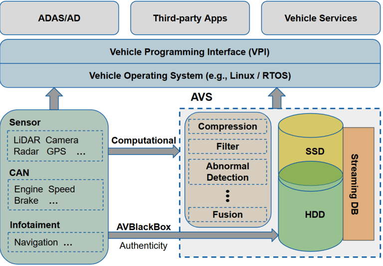 AVS is a storage system designed for autonomous vehicles, which aims to give a clear picture of the significant interactions between the environment and the autonomous driving system by storing a set of data.